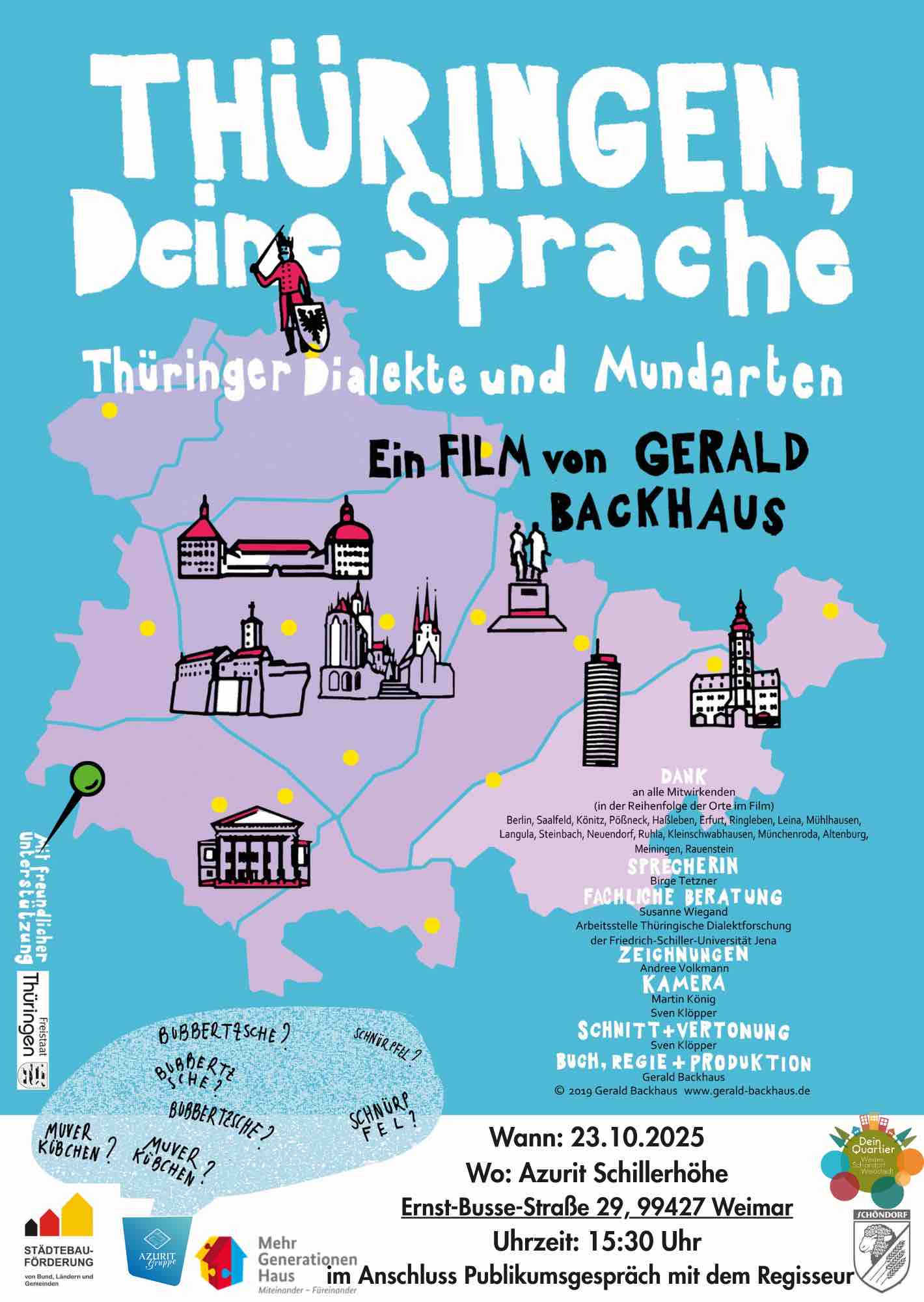 Sie möchten Thüringen, Deine Sprache in Ihrem Ort im Kino, Theater, Kulturzentrum, Gaststätte, Kirche, Schule, Museum, Kulturscheune, Jugendclub, Seniorenakademie, Volkshochschule, Heimatverein oder einem anderen Ort öffentlich vorführen? Bitte setzen Sie sich mit uns per Mail an gerald.backhaus@berlin.de dazu in Verbindung.